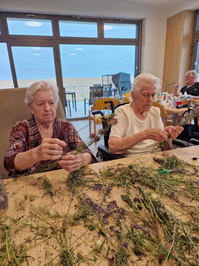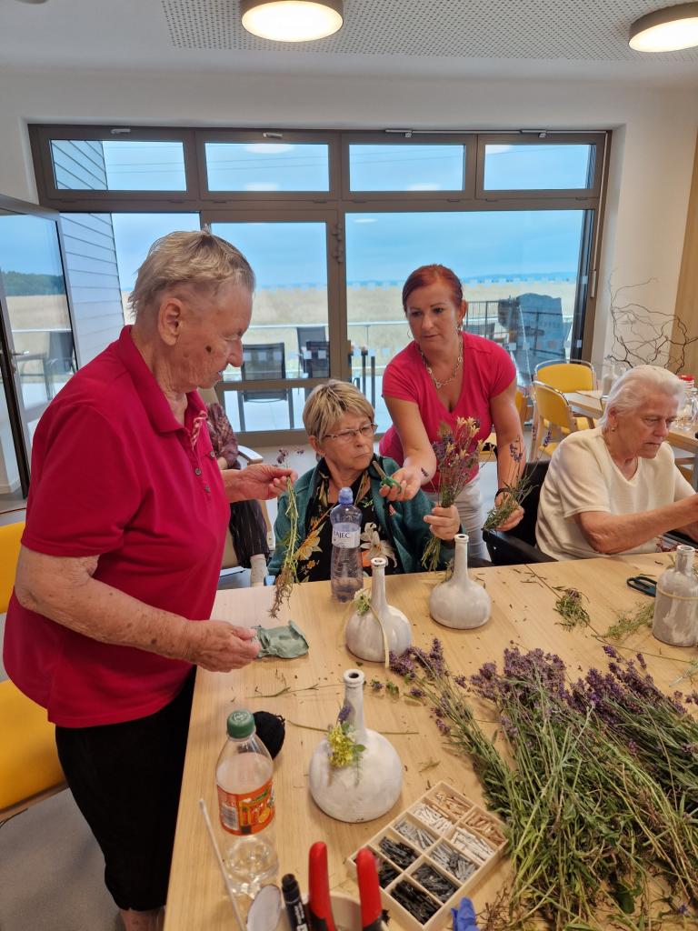 Náš domov provoněla oblíbená levandule, která má nejen uklidňující vůni, ale dokáže i zlepšit náladu. Vázali jsme kytice do váziček, které jsme natírali a zdobili již dříve společně s muži z našeho DSS.